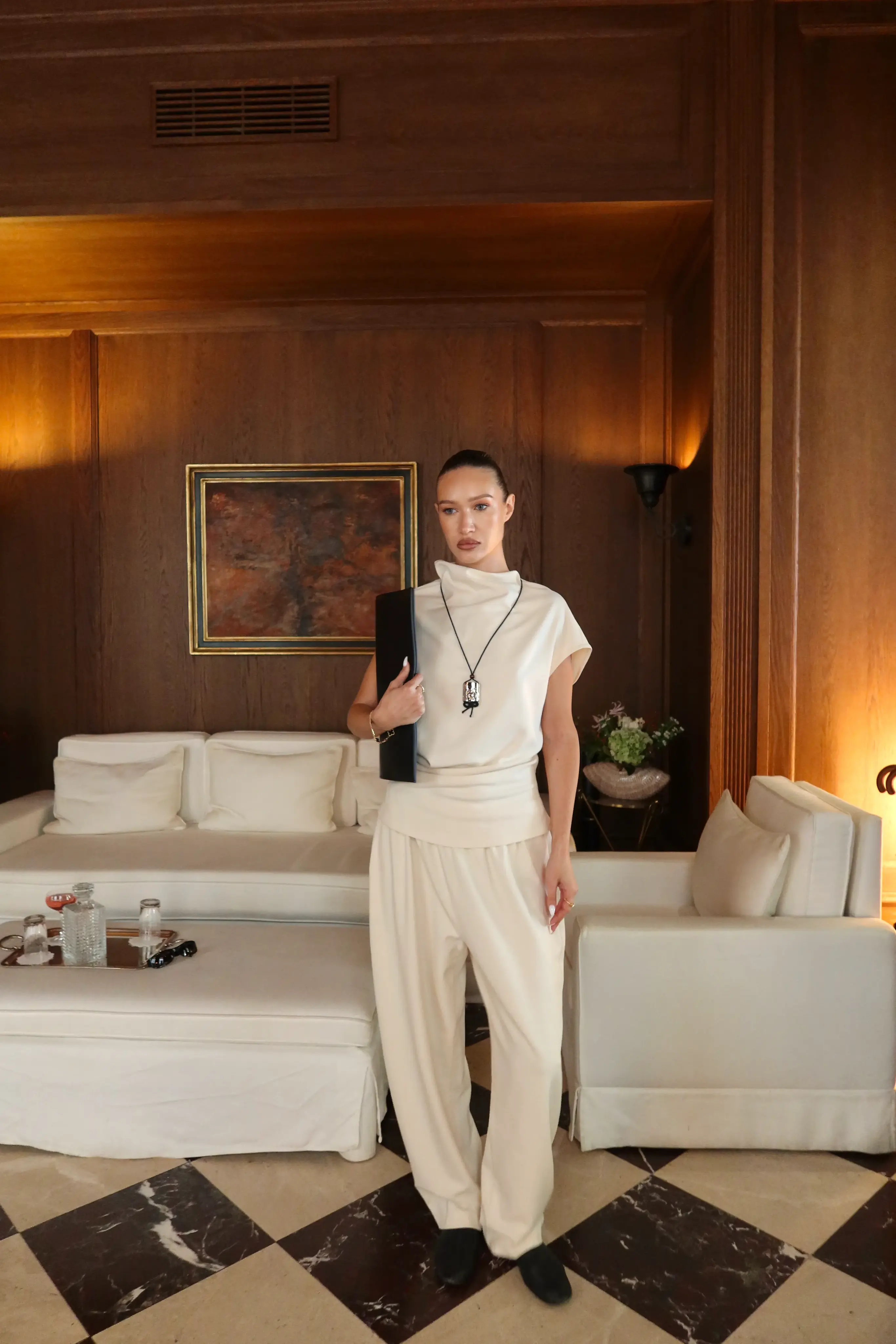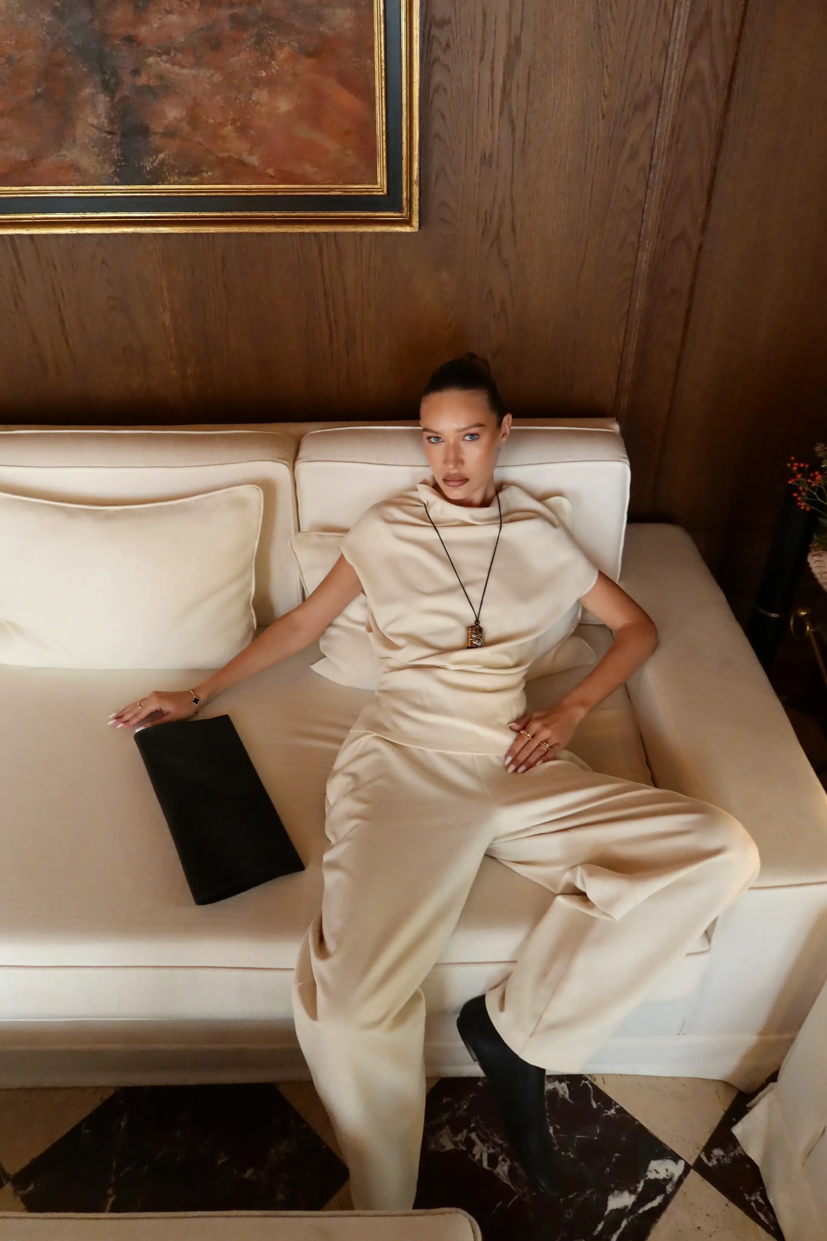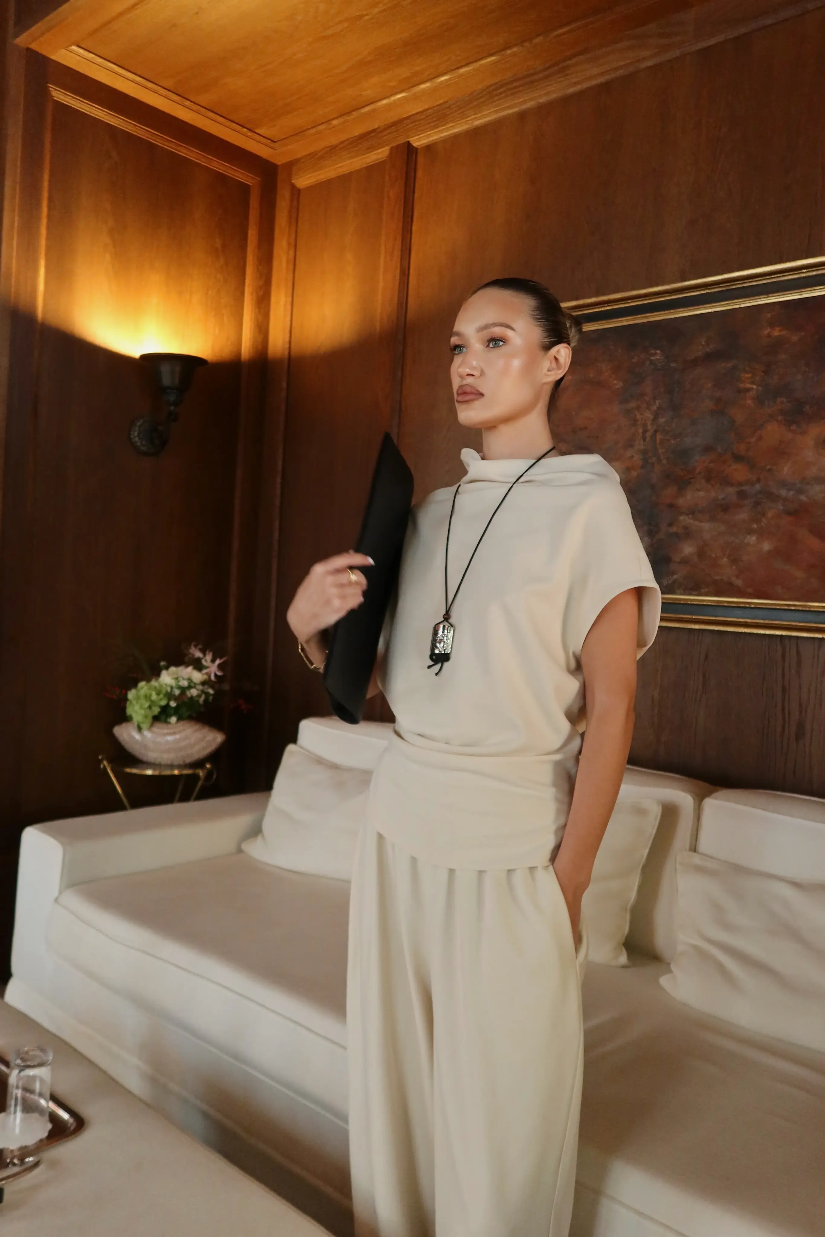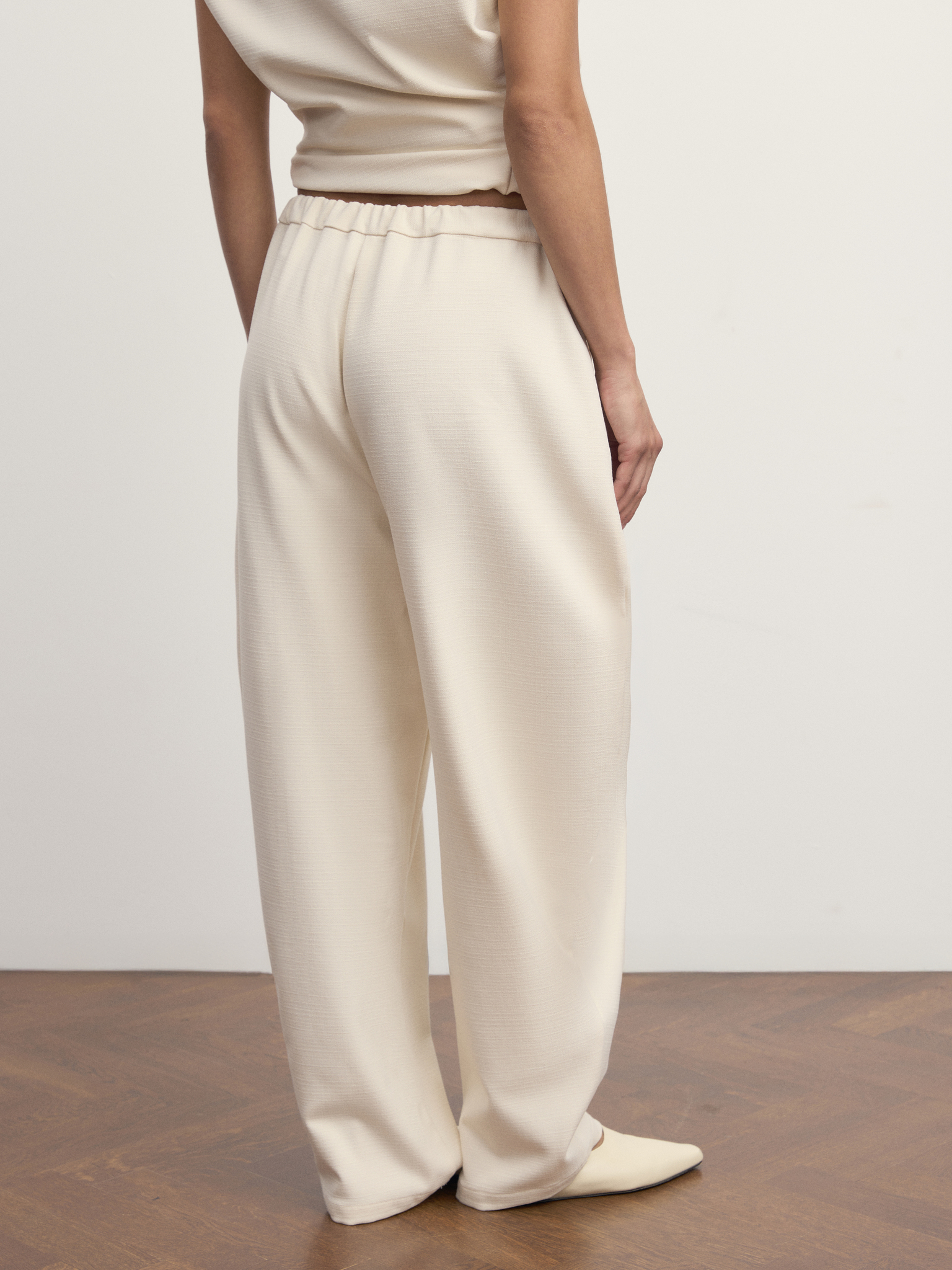Элегантный свободный силуэт с мягкой линией талии на резинке и удлинёнными штанинами визуально вытягивает фигуру, а струящаяся ткань дарит ощущение лёгкости.