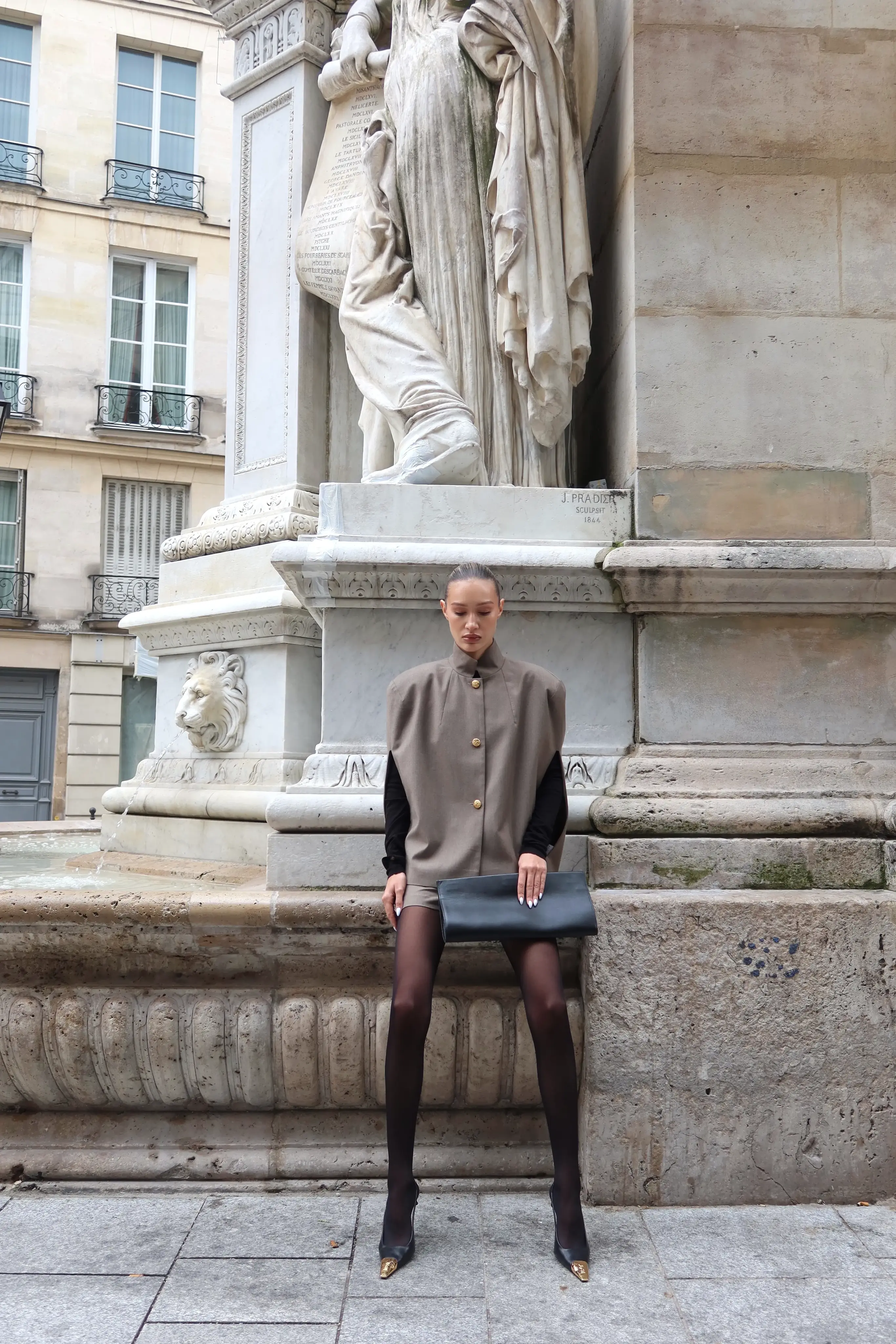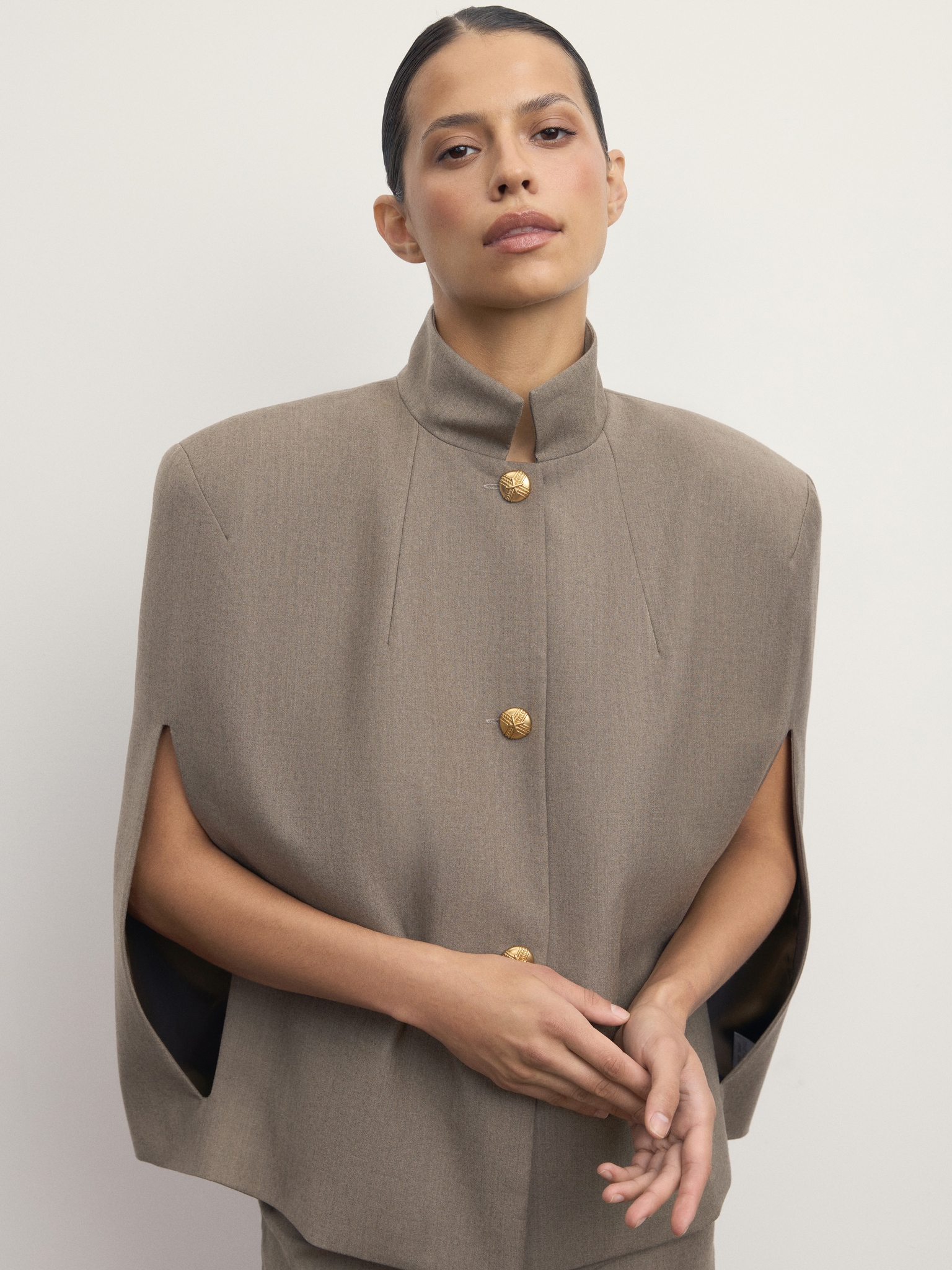 Элегантный кейп Vintage — воплощение сдержанной роскоши и современной классики. Лаконичный силуэт с чёткими линиями и акцентными плечами придаёт образу архитектурную чёткость, а золотые пуговицы в винтажном стиле добавляют благородный штрих.