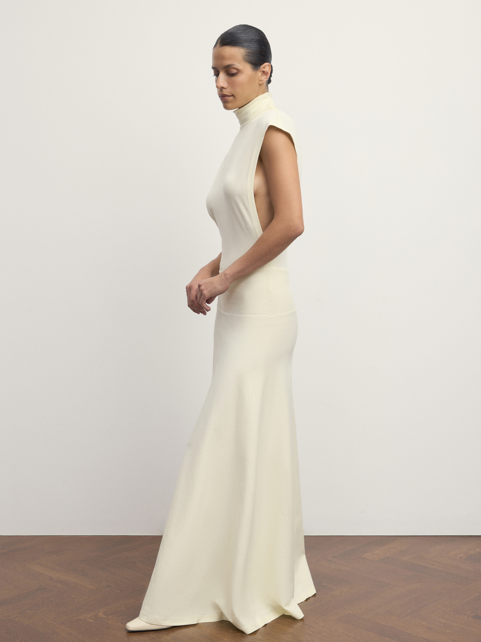 Макси-длина и плавное движение материала при ходьбе подчёркивают женственность и элегантность, а лаконичный крой делает модель универсальной для особых случаев и вечерних выходов.