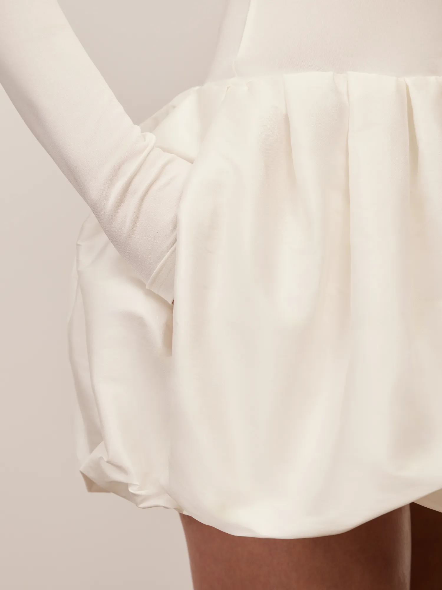 Платье с контрастом форм и фактур. Лаконичный верх с высокой горловиной и длинными рукавами подчеркивает линию плеч и создает чистый, вытянутый силуэт. Объемная юбка-баллон добавляет архитектурность и формирует выразительный акцент на талии.