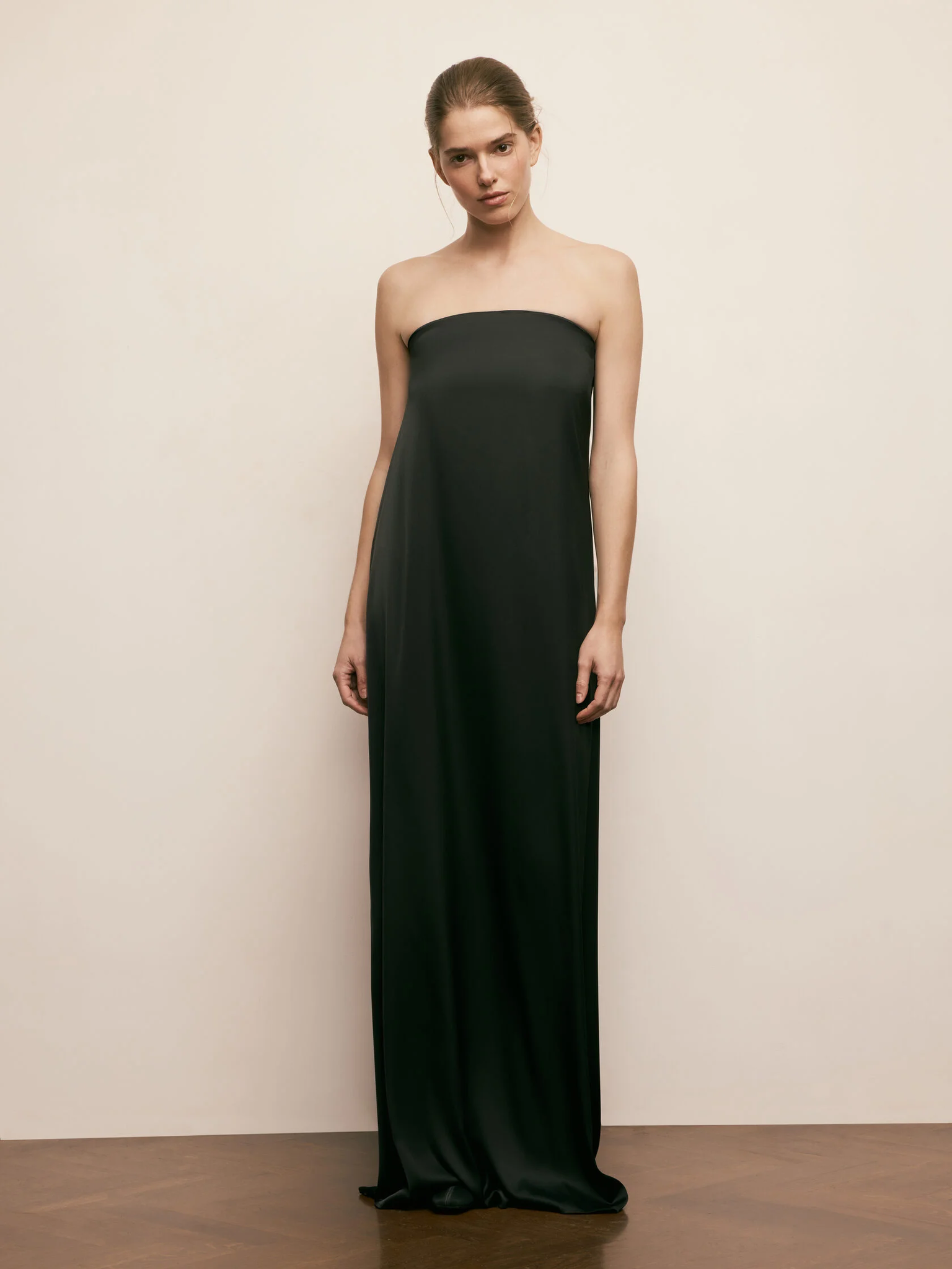 Роскошное вечернее платье с открытой спиной, выполненное из струящейся черной ткани с шелковистым блеском. Глубокий драпированный вырез на спине придает образу смелости и чувственности, а тонкая эластичная лента на уровне лопаток аккуратно фиксирует платье, сохраняя изящество линий. Лаконичный крой и эффектный силуэт делают это платье идеальным выбором для особых случаев, где важны стиль и утонченность.