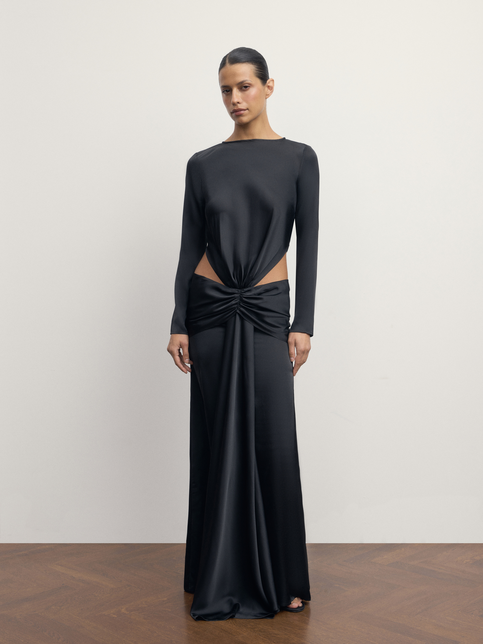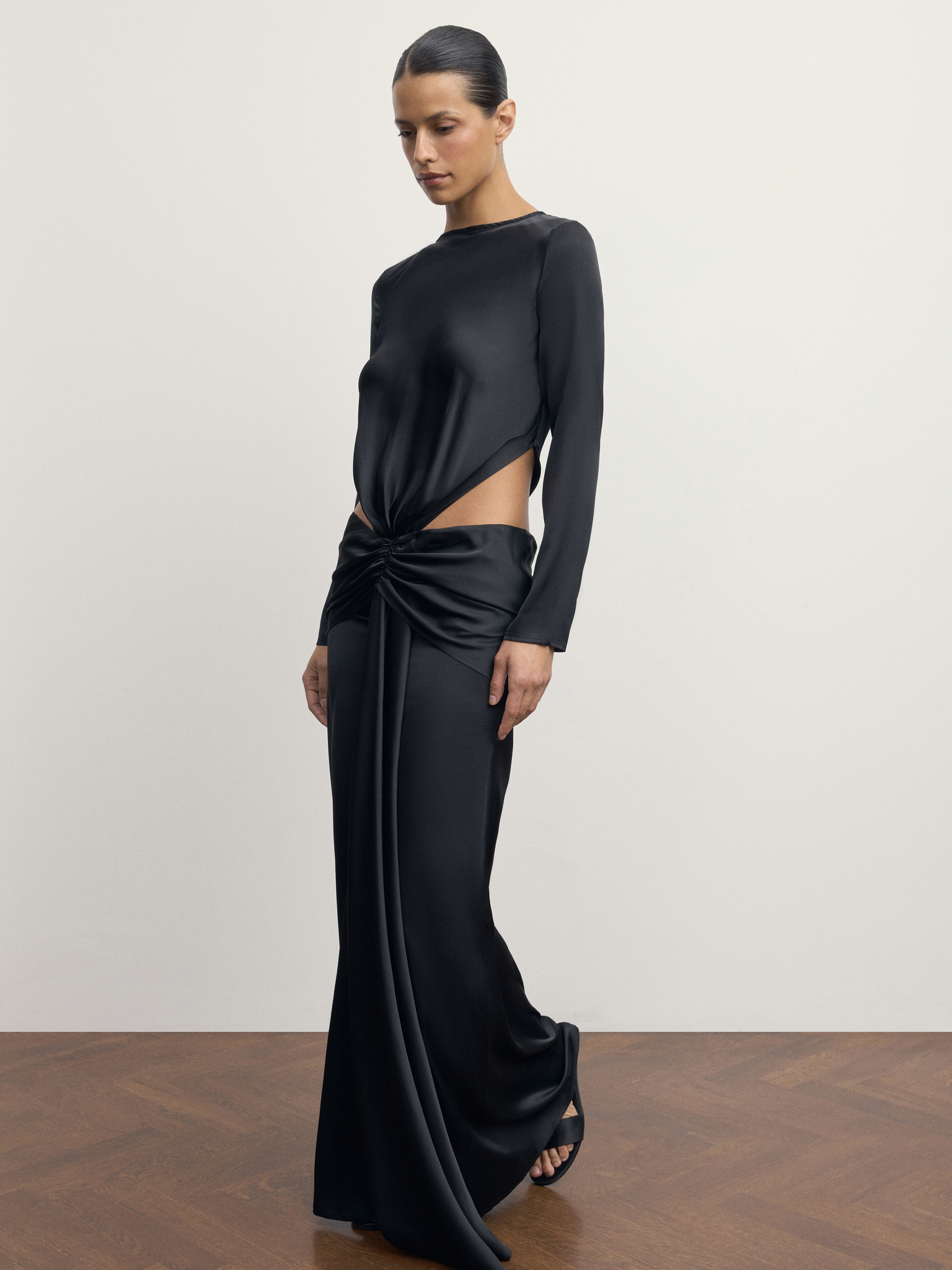 Платье The Edit — лаконичный верх с длинными рукавами уравновешивает выразительный акцент — драпировку и эффектные вырезы в области талии, которые формируют женственный силуэт и подчеркивают изящество фигуры.