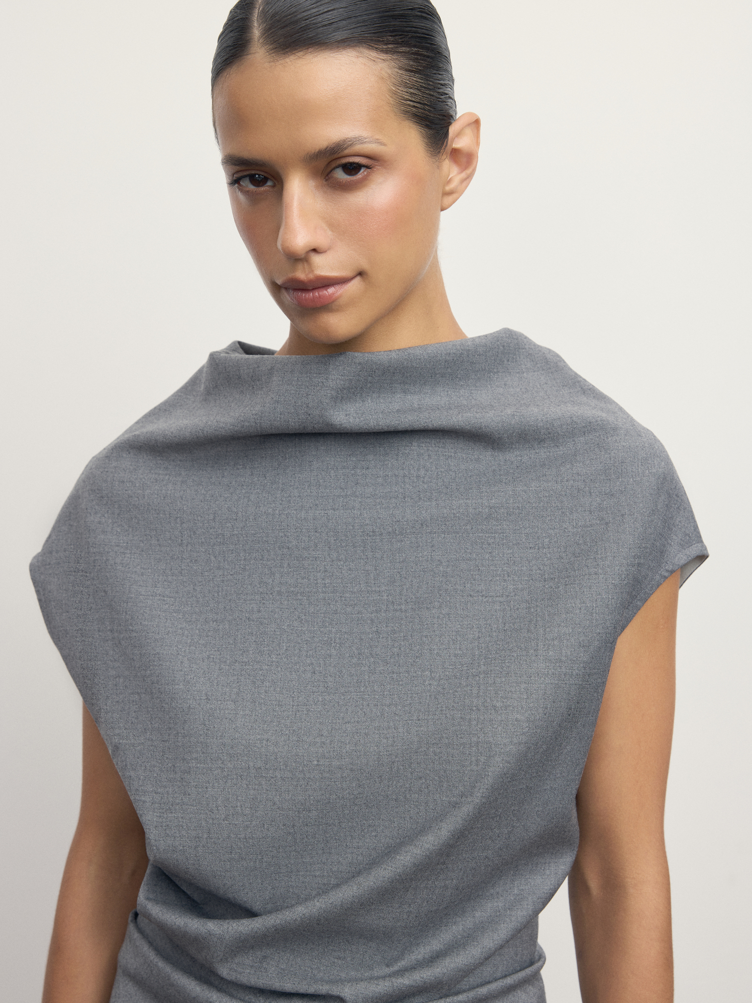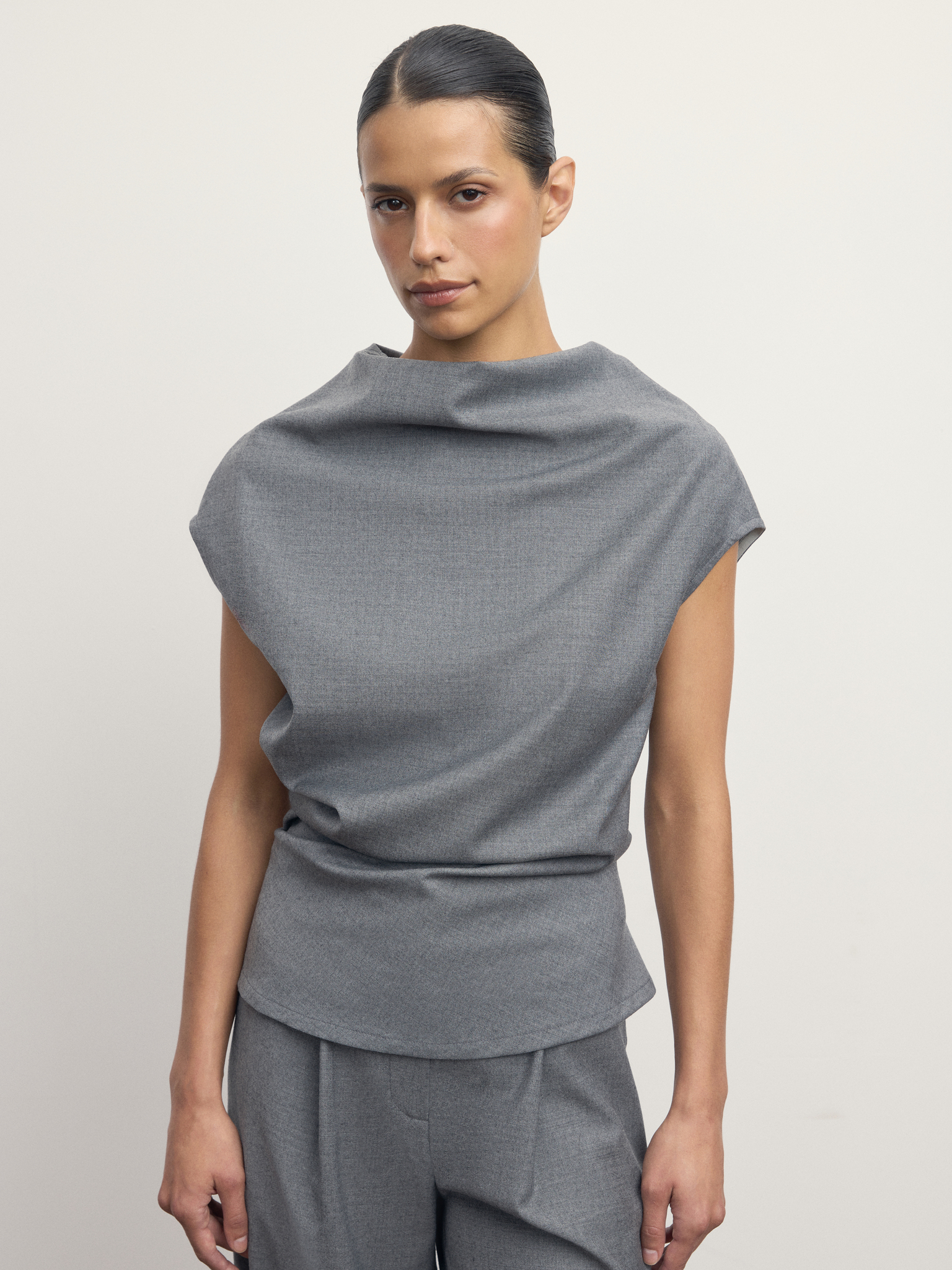 Минималистичный и элегантный — топ Lunar создан для тех, кто ценит чистые линии и современную форму. Мягкий драпированный ворот создает скульптурный силуэт, а плотная ткань хорошо держит форму и подчёркивает геометрию кроя. Укороченный рукав и удлинённый низ придают модели универсальность — её легко сочетать как с классическими брюками, так и с джинсами или юбкой