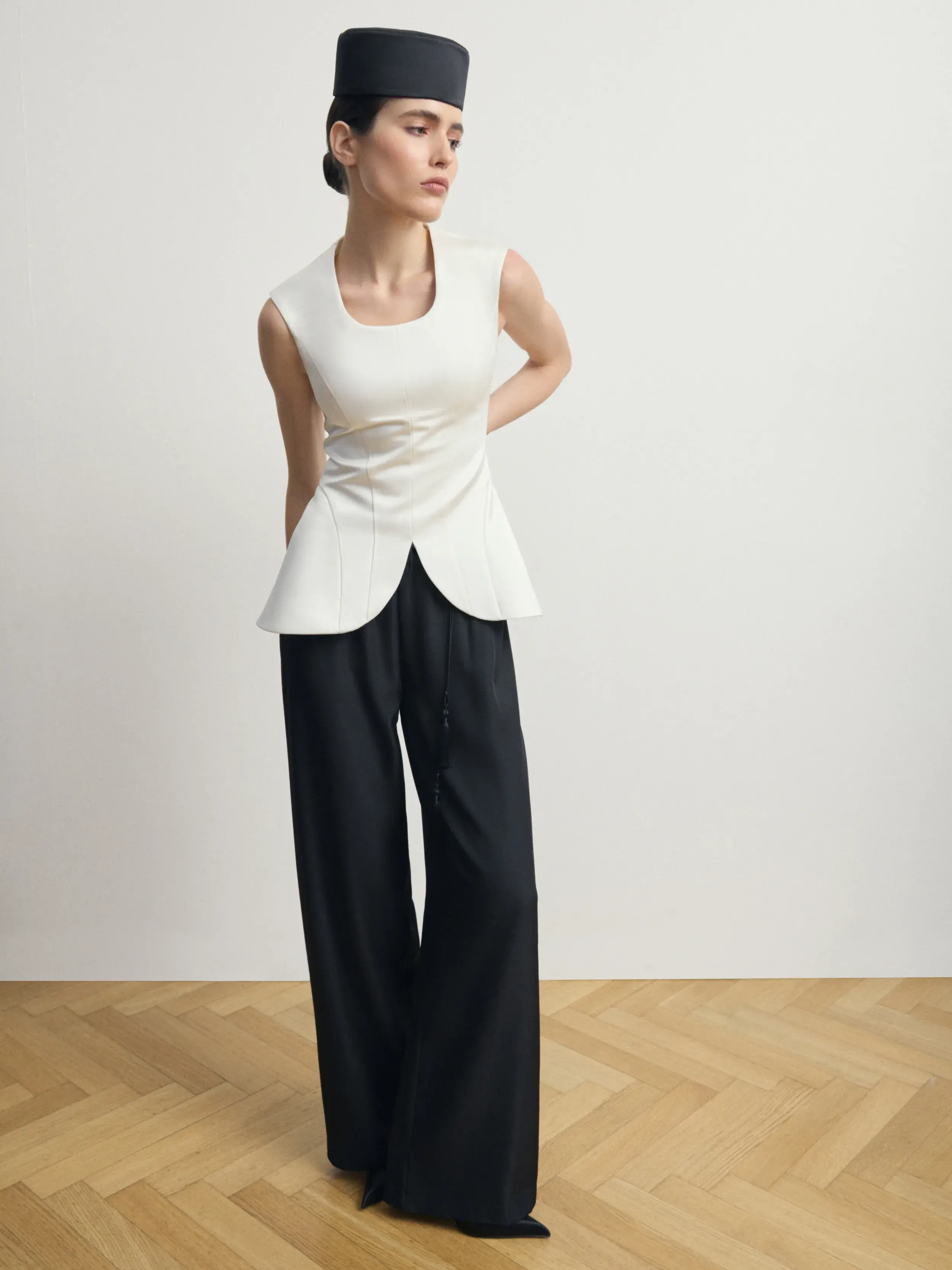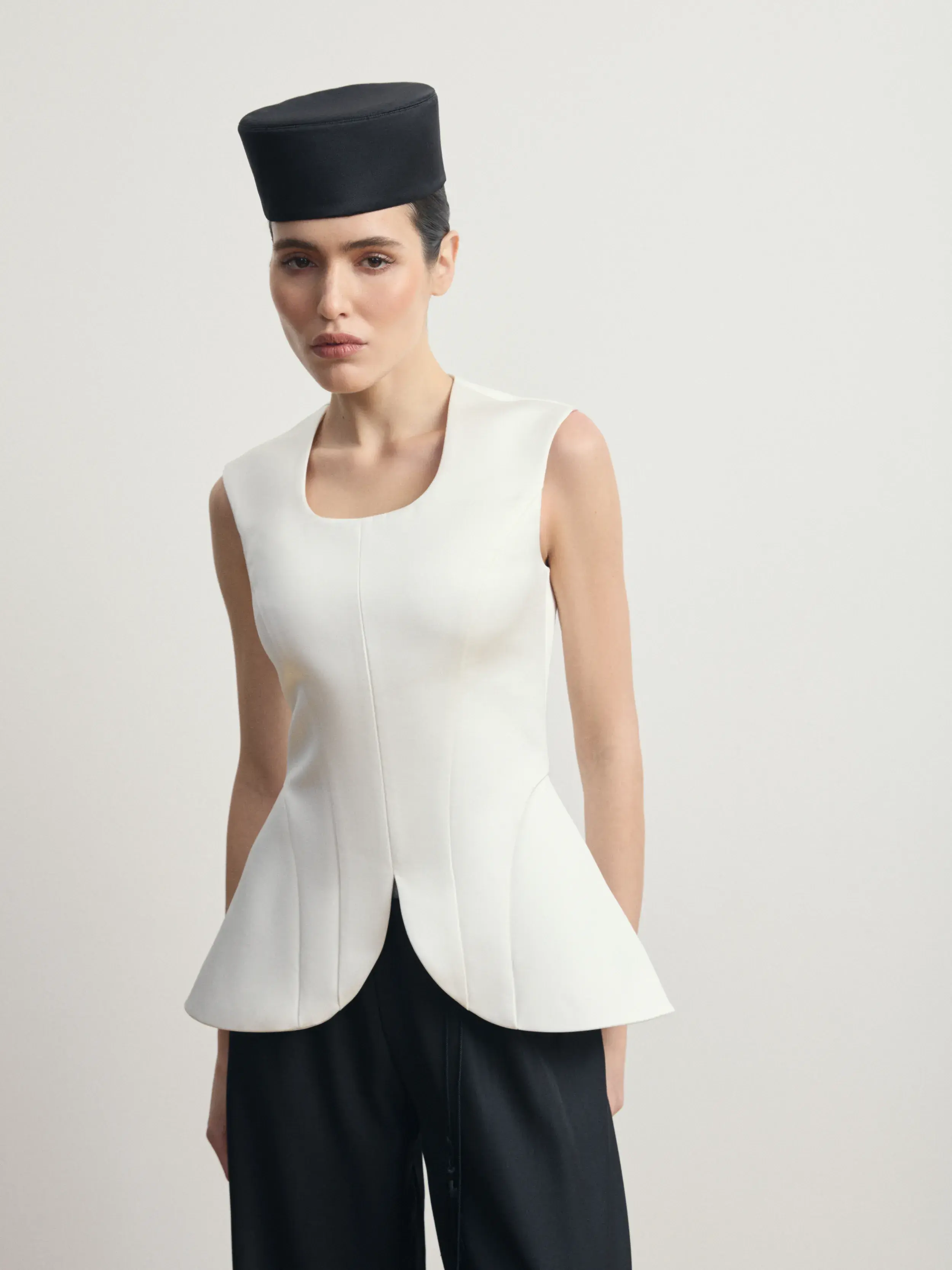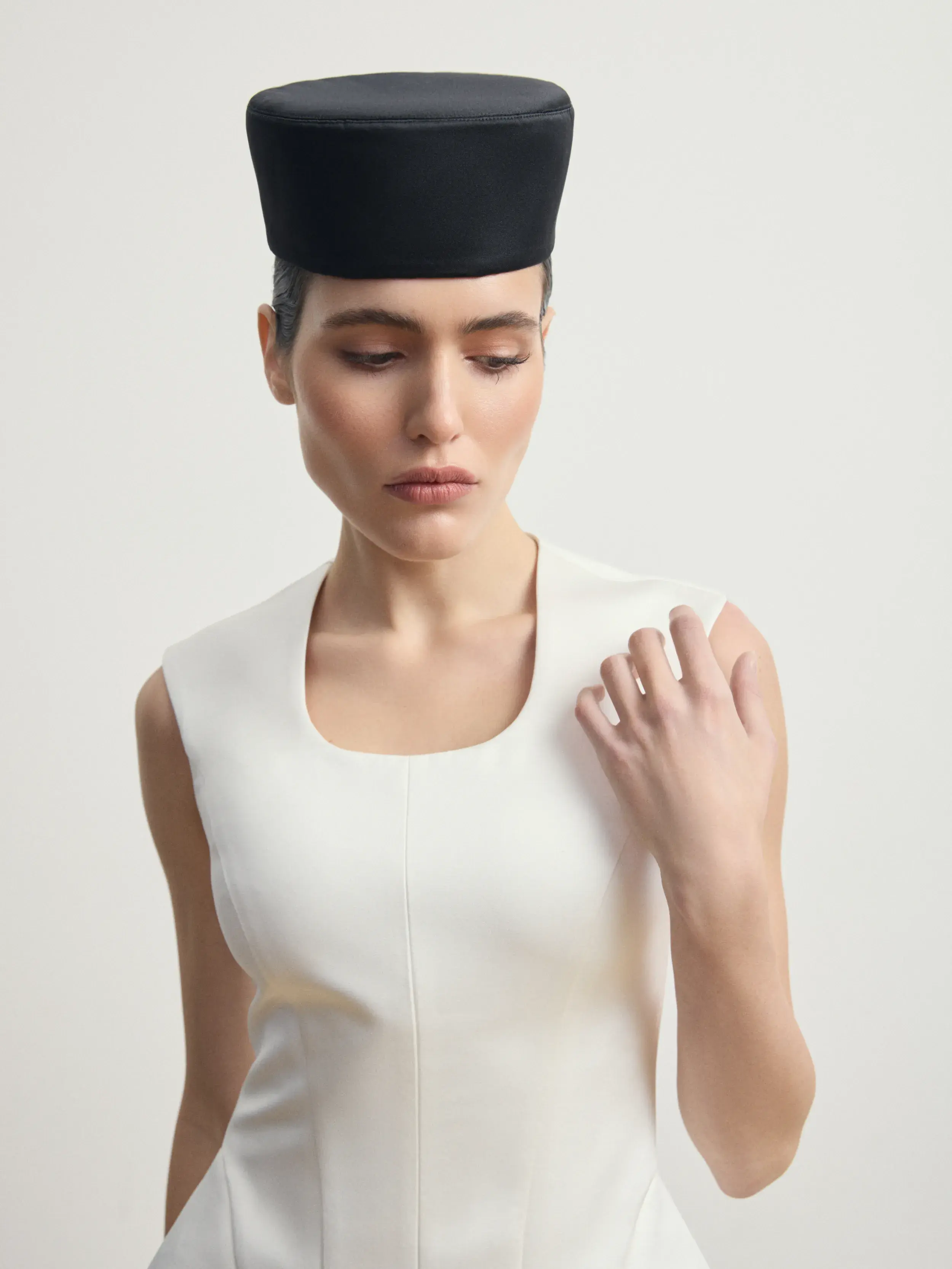 Минималистичная шляпа-таблетка в лаконичной геометричной форме создаёт утончённый, современный силуэт. Плотная гладкая ткань и безупречно выверенные линии придают аксессуару архитектурную чёткость. Модель элегантно садится на голову и подчёркивает образ, добавляя ему нотку ретро-шика и высокой моды. Идеальный выбор для вечерних выходов, торжественных мероприятий и стильных съёмок.