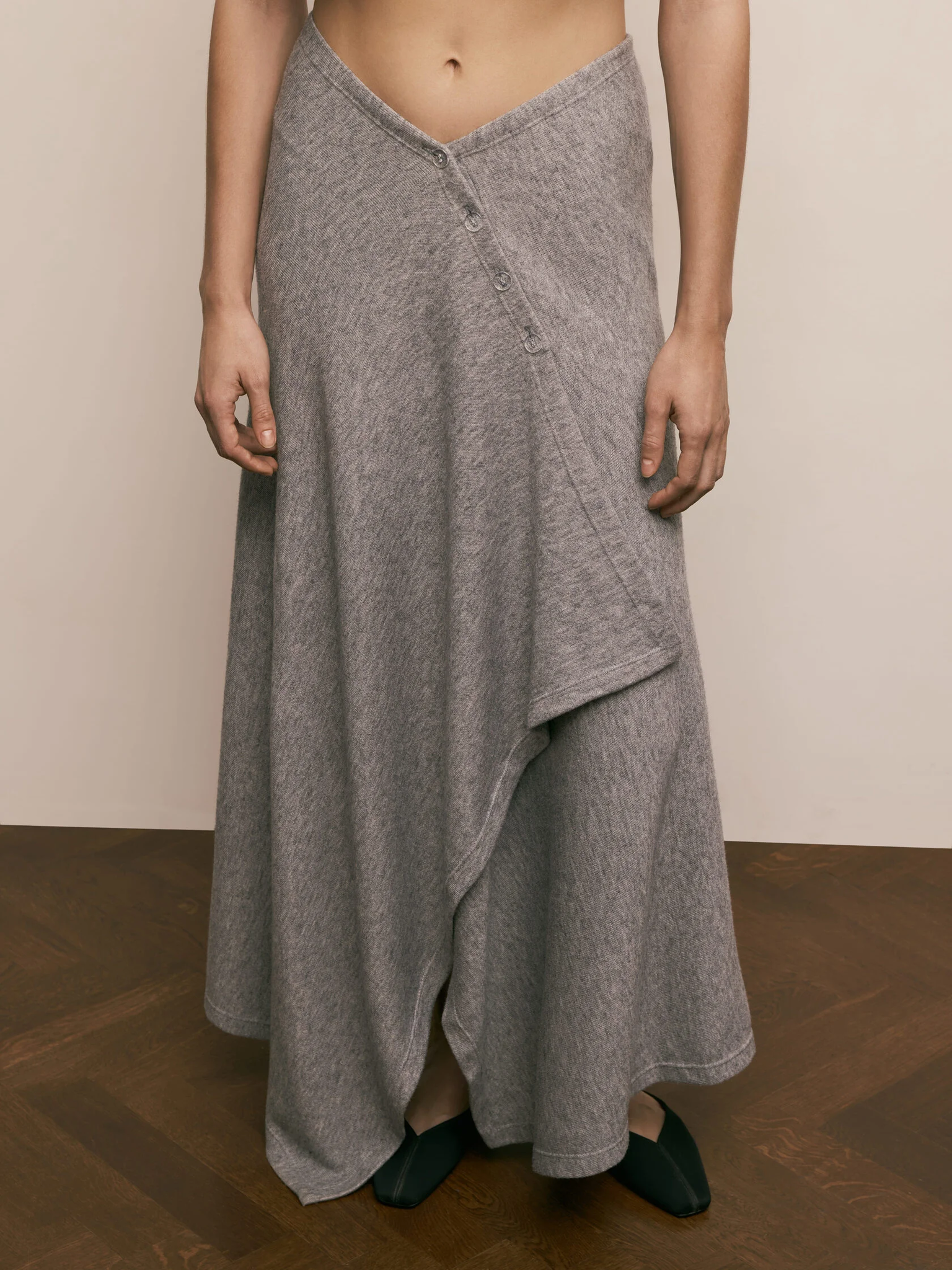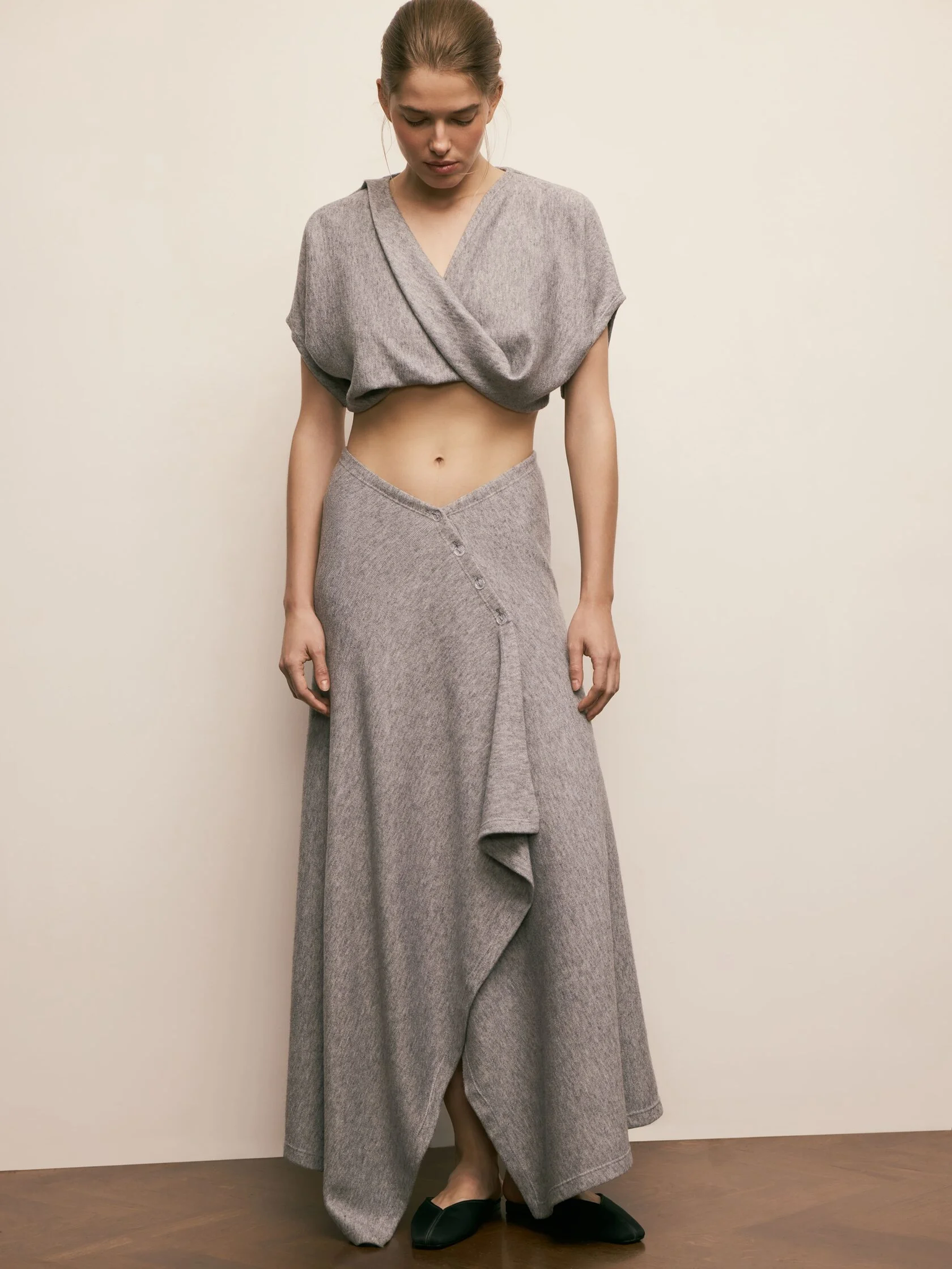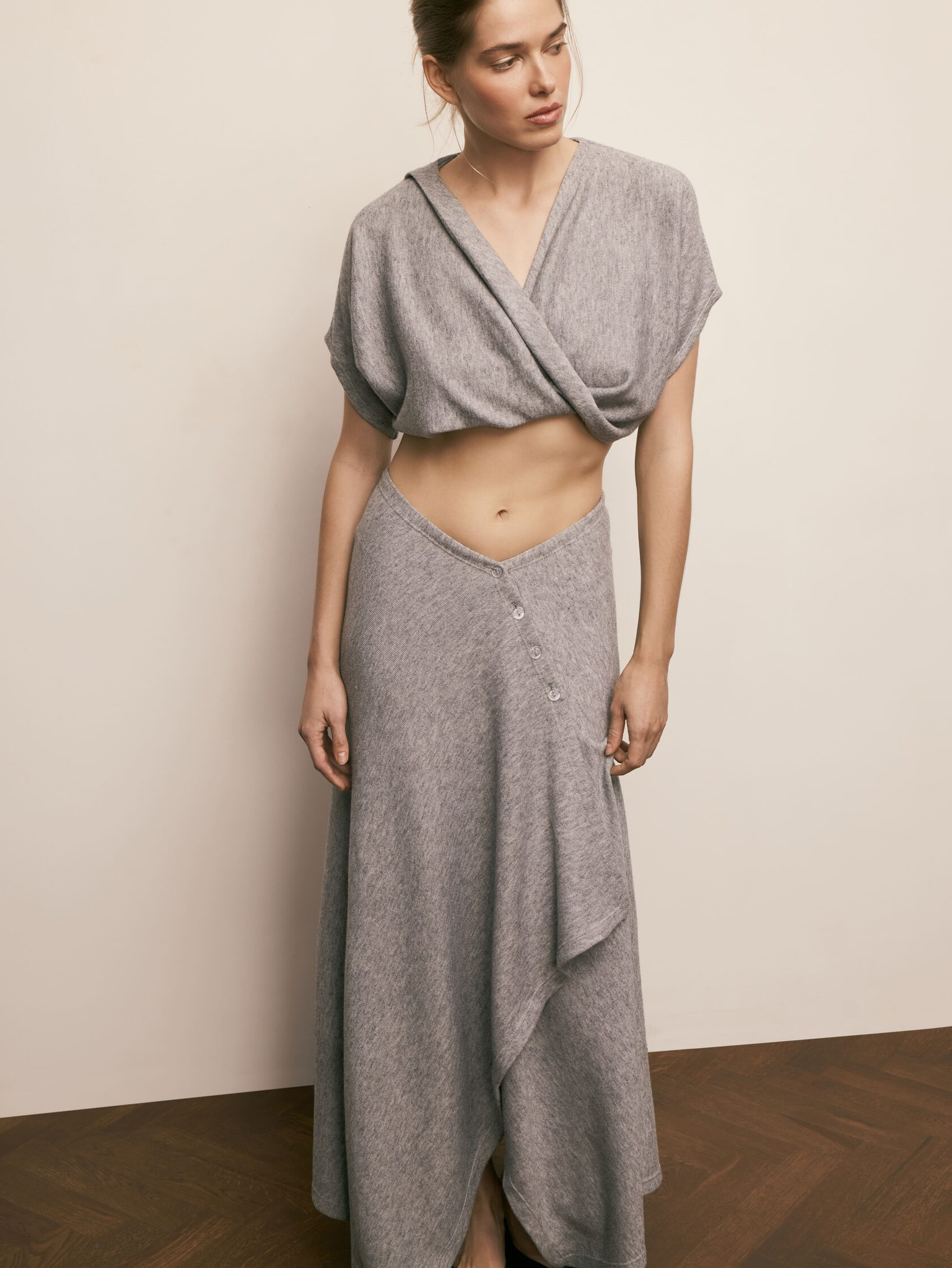 Глубокий V-образный вырез на талии подчеркивает фигуру, создавая эффект утонченной грации, а неровный нижний край добавляет динамики и легкости образу. Застежка на пуговицах не только функциональна, но и служит стильным акцентом, подчеркивая крой. Выполненная из мягкого трикотажа, юбка комфортно облегает тело, обеспечивая свободу движений и идеальную посадку.