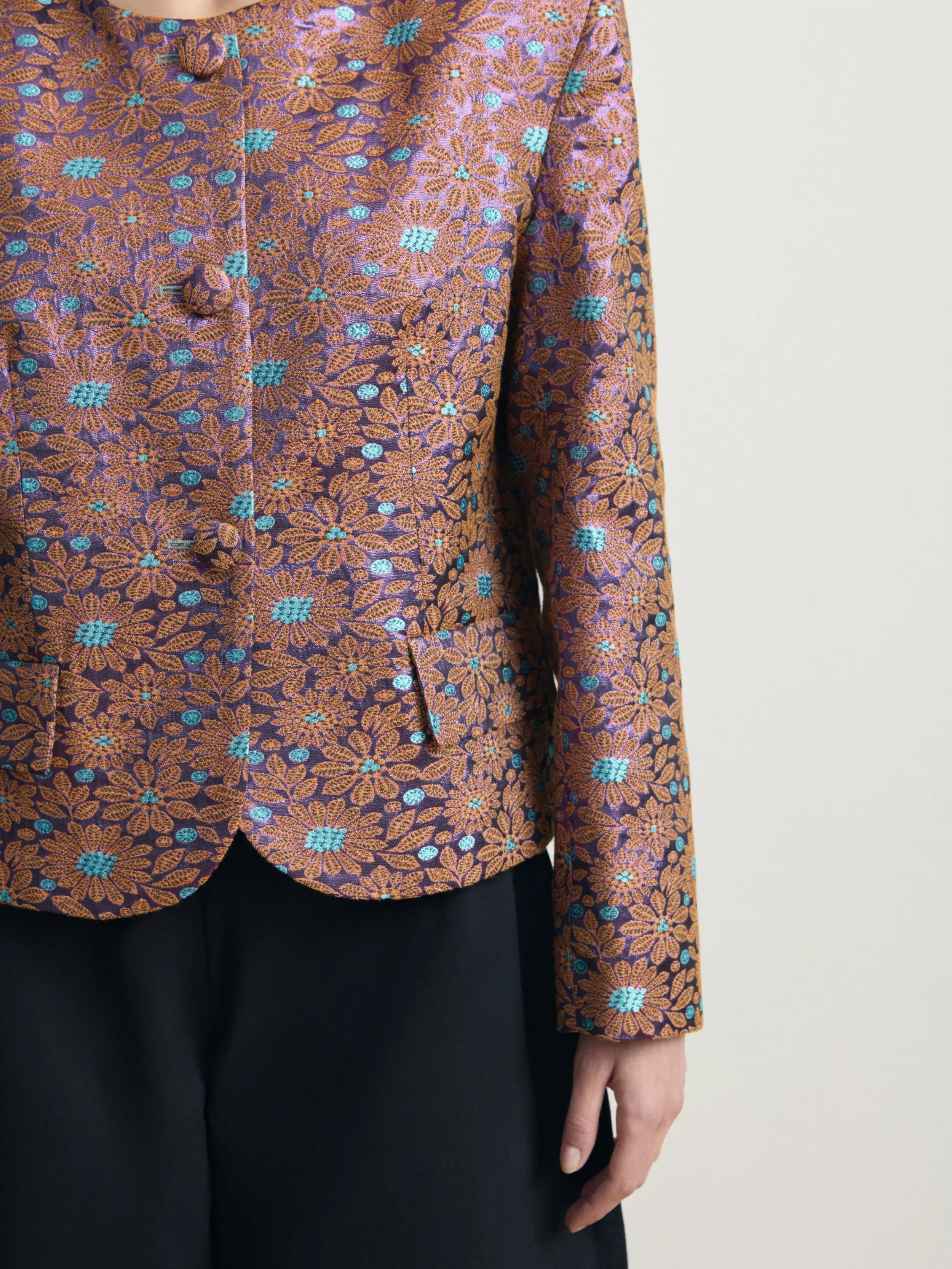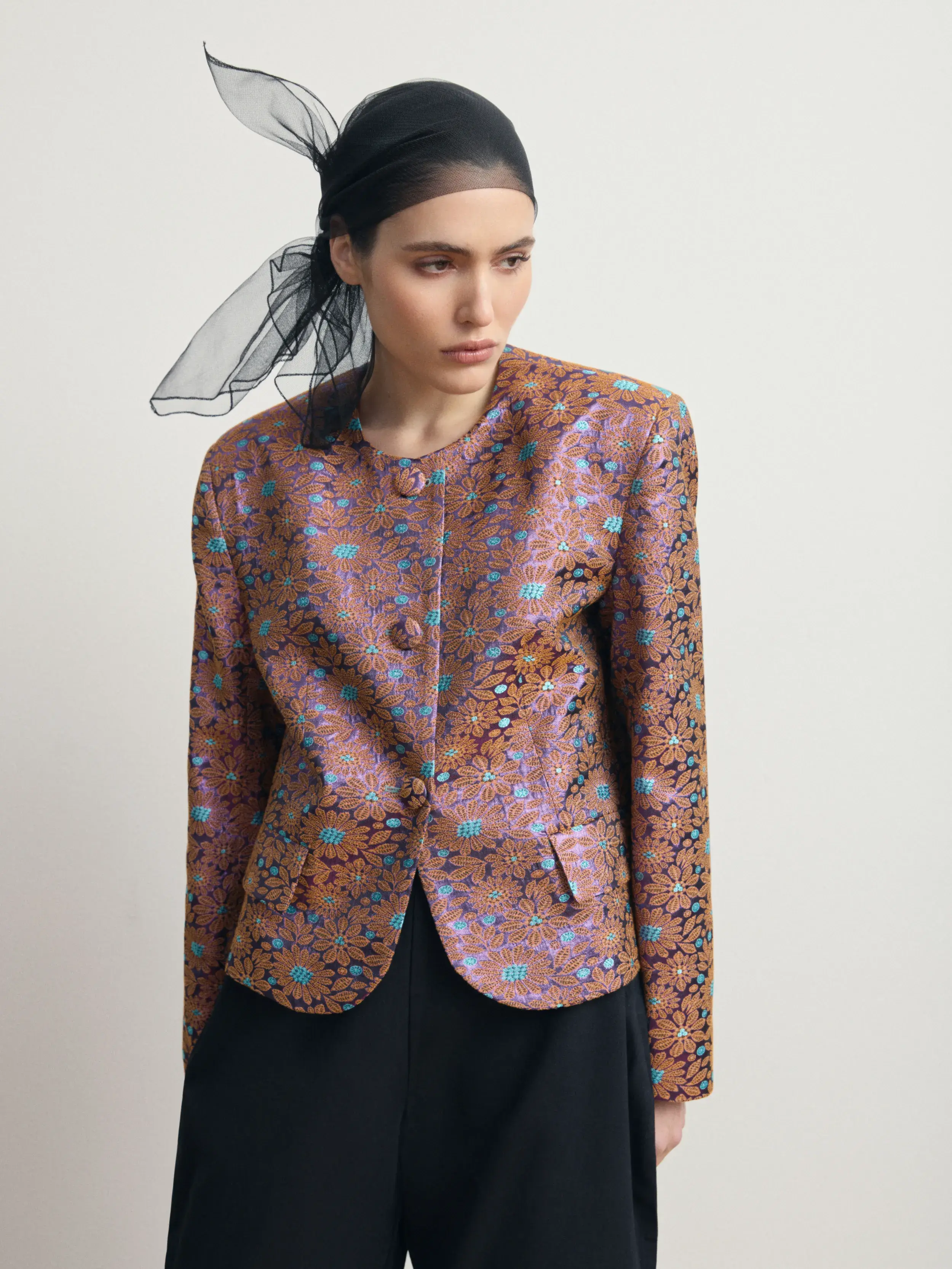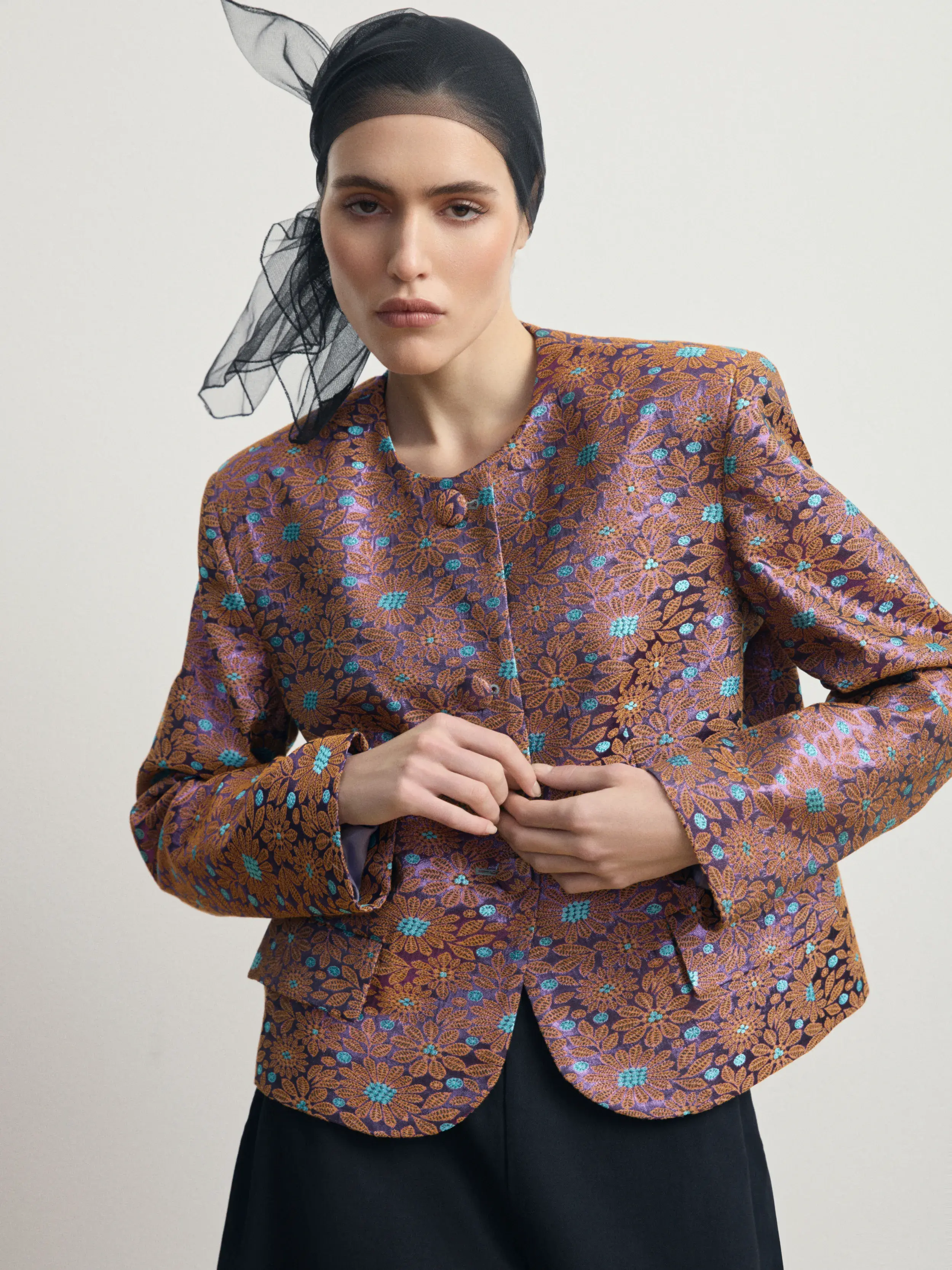 Структурный жакет из плотного жаккарда с выразительным фактурным узором «ромашка». Модель выполнена с округлой линией горловины и обтянутыми пуговицами. Прямой крой и акцентированные плечи создают аккуратную архитектурную форму, сохраняя комфорт и идеальную посадку. Жакет становится центральным элементом образа, сочетая современную строгость с декоративной насыщенностью ткани.