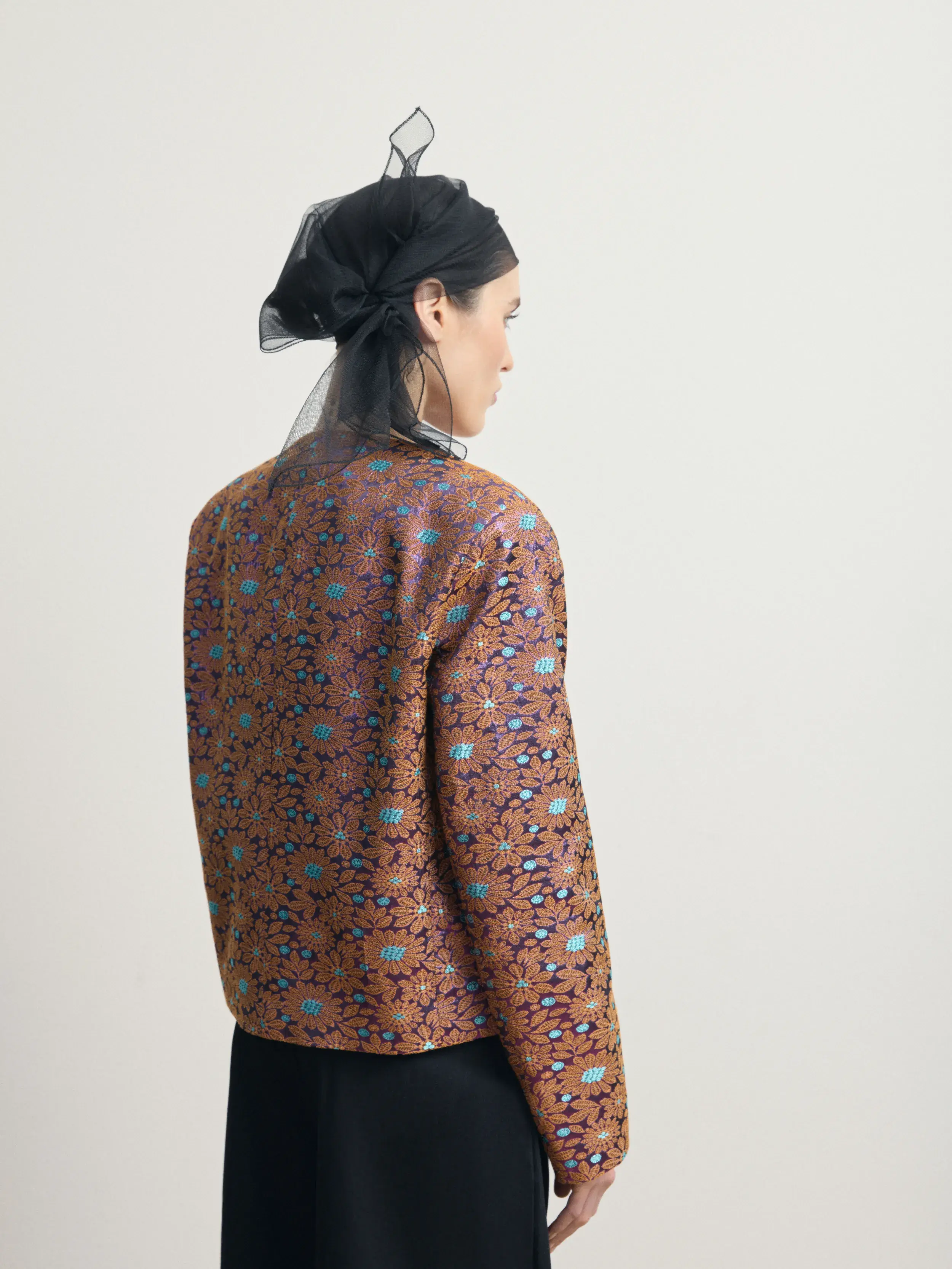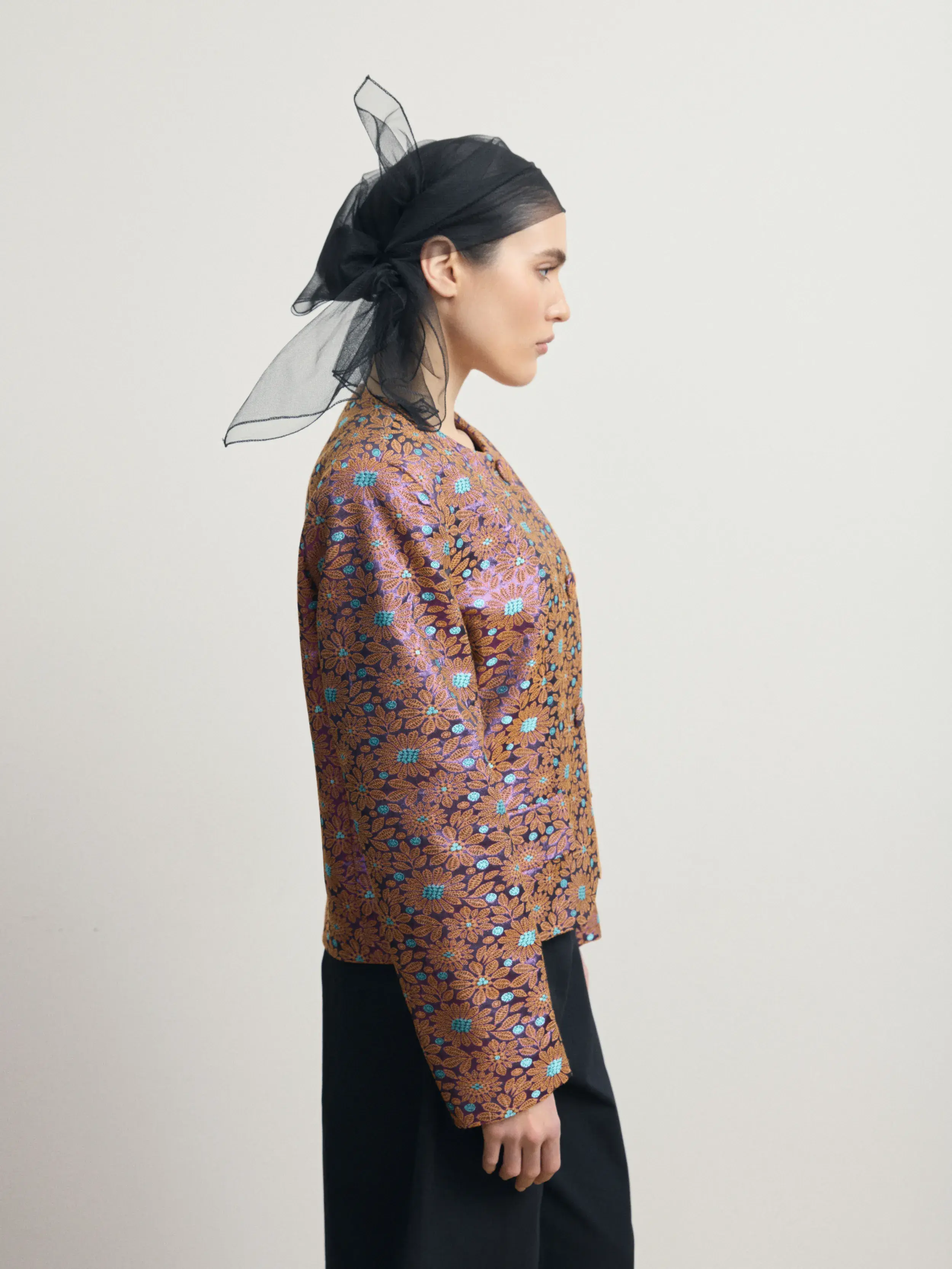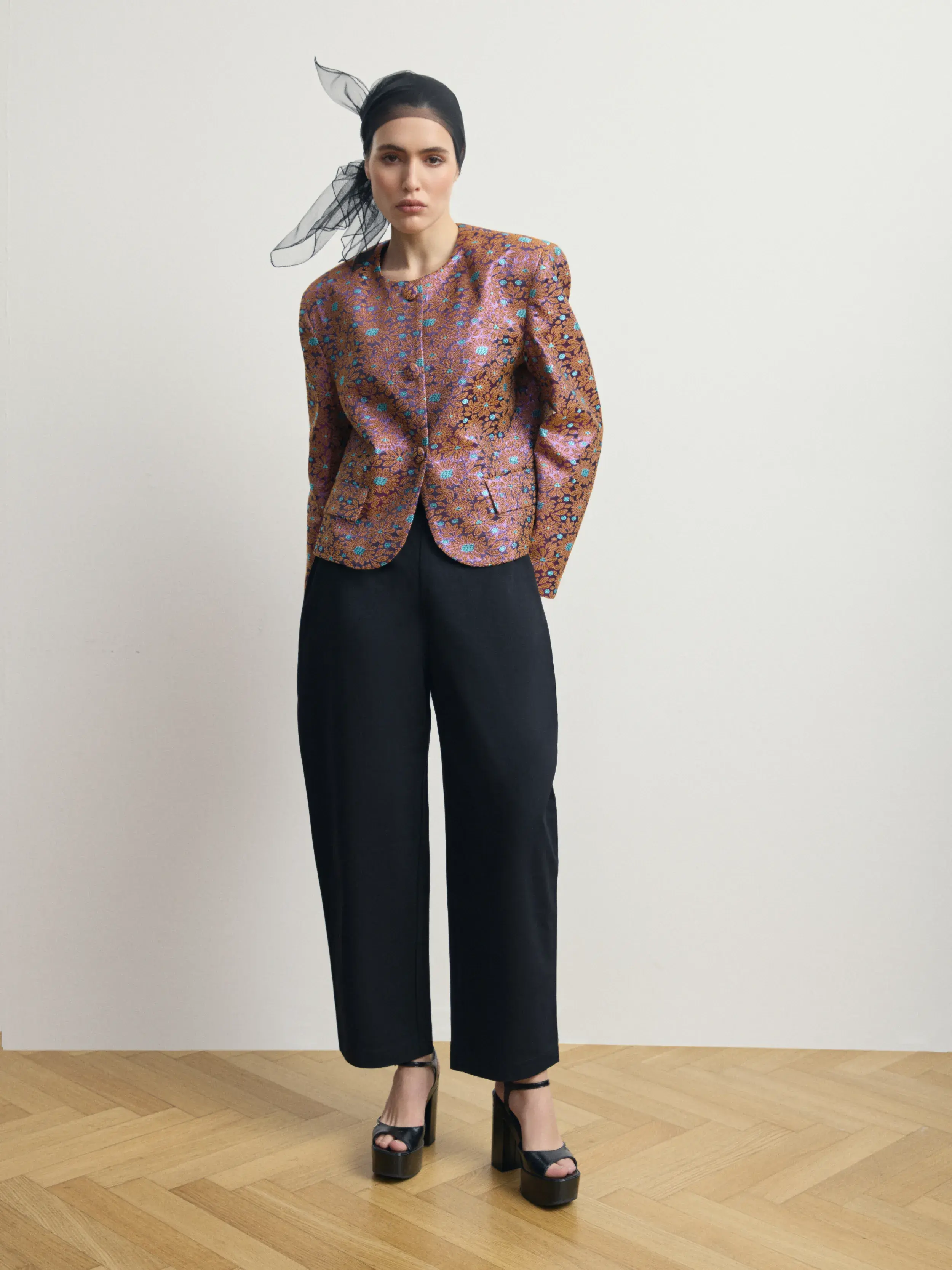 Структурный жакет из плотного жаккарда с выразительным фактурным узором «ромашка». Модель выполнена с округлой линией горловины и обтянутыми пуговицами. Прямой крой и акцентированные плечи создают аккуратную архитектурную форму, сохраняя комфорт и идеальную посадку. Жакет становится центральным элементом образа, сочетая современную строгость с декоративной насыщенностью ткани.