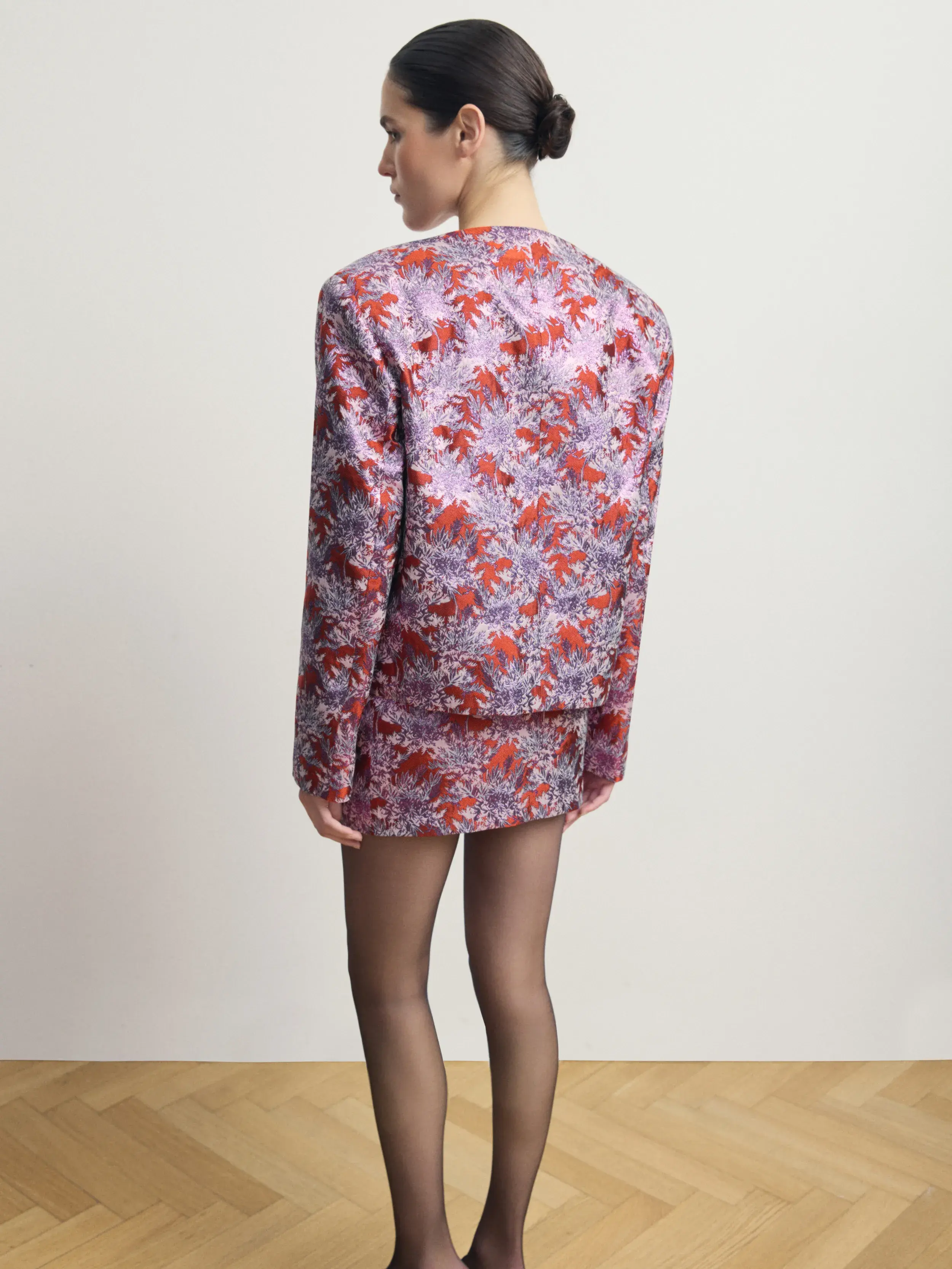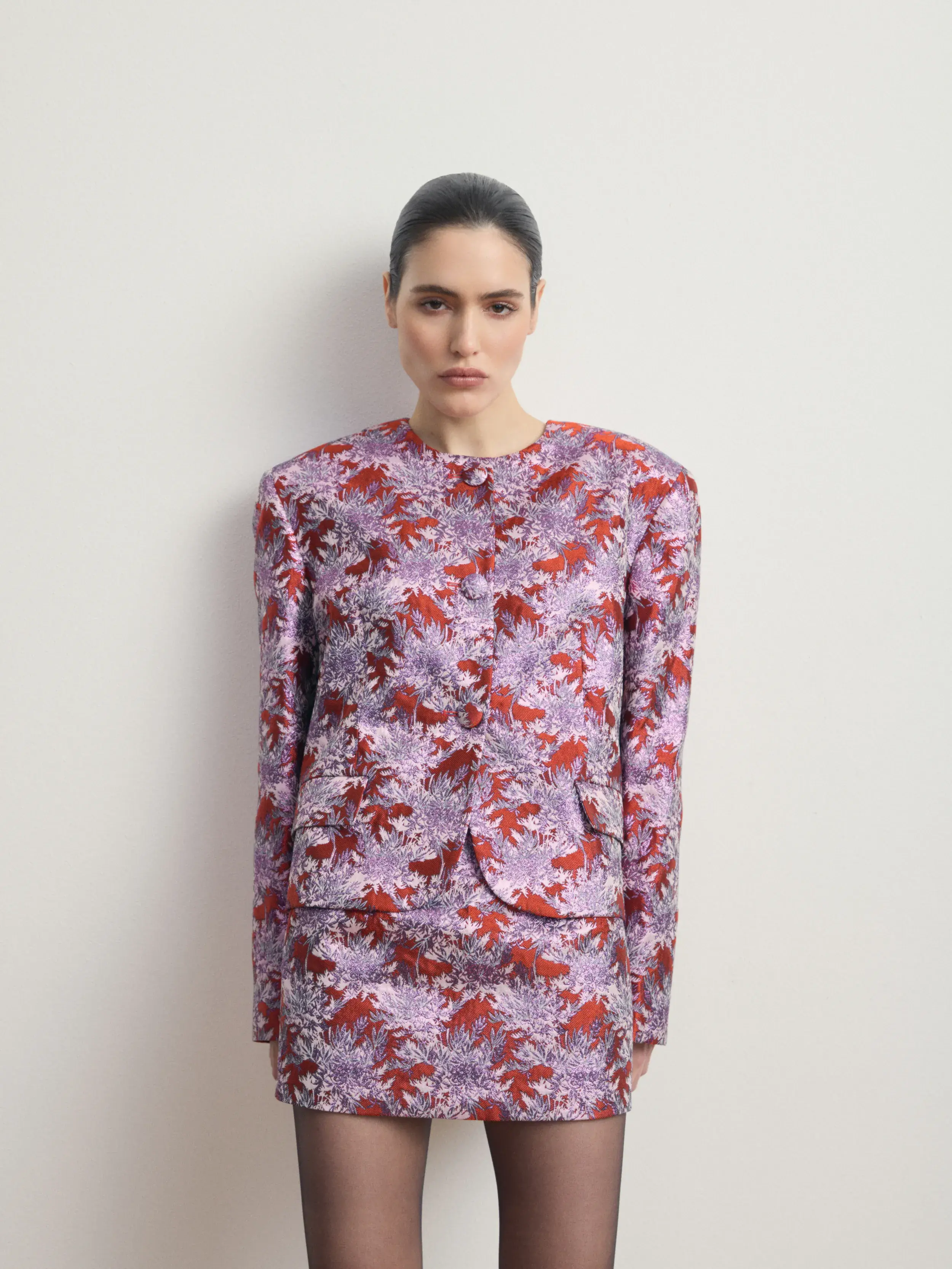 Структурный жакет из плотного жаккарда с выразительным фактурным узором в оттенках красного и розового. Модель выполнена с округлой линией горловины и обтянутыми пуговицами. Прямой крой и акцентированные плечи создают аккуратную архитектурную форму, сохраняя комфорт и идеальную посадку. Жакет становится центральным элементом образа, сочетая современную строгость с декоративной насыщенностью ткани.